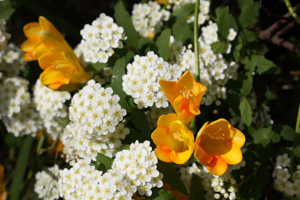 雪柳の下に咲いていた、オレンジの花は何?