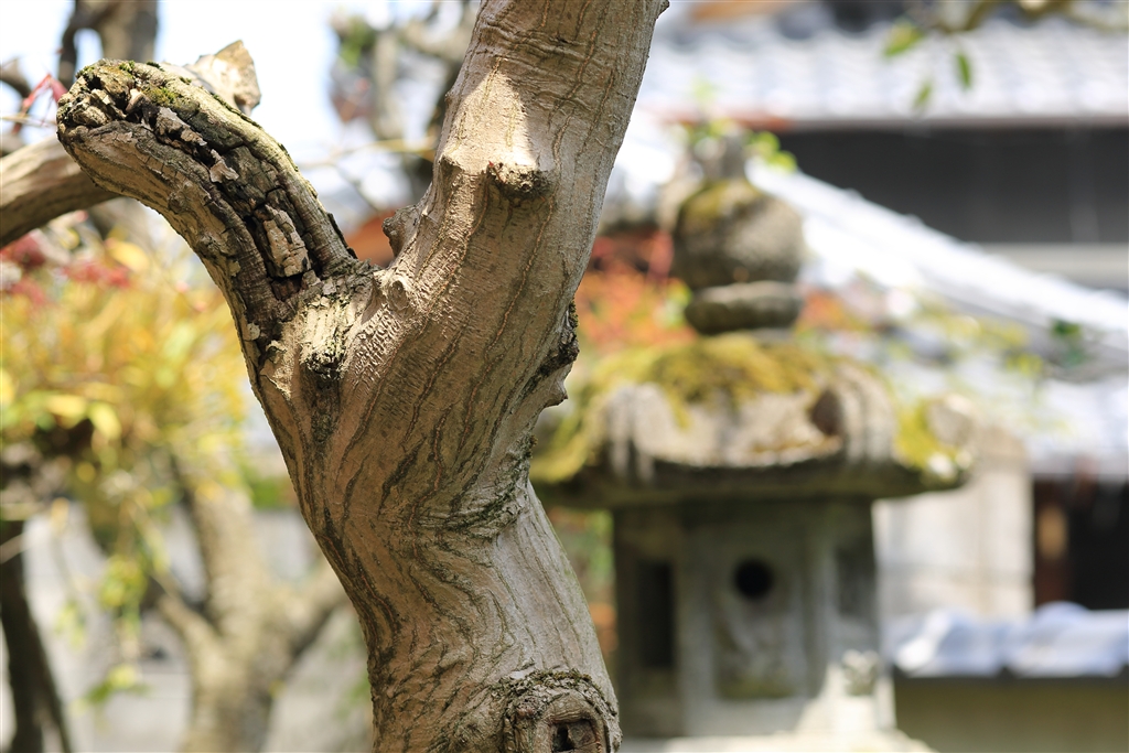 木の幹越しに灯篭を