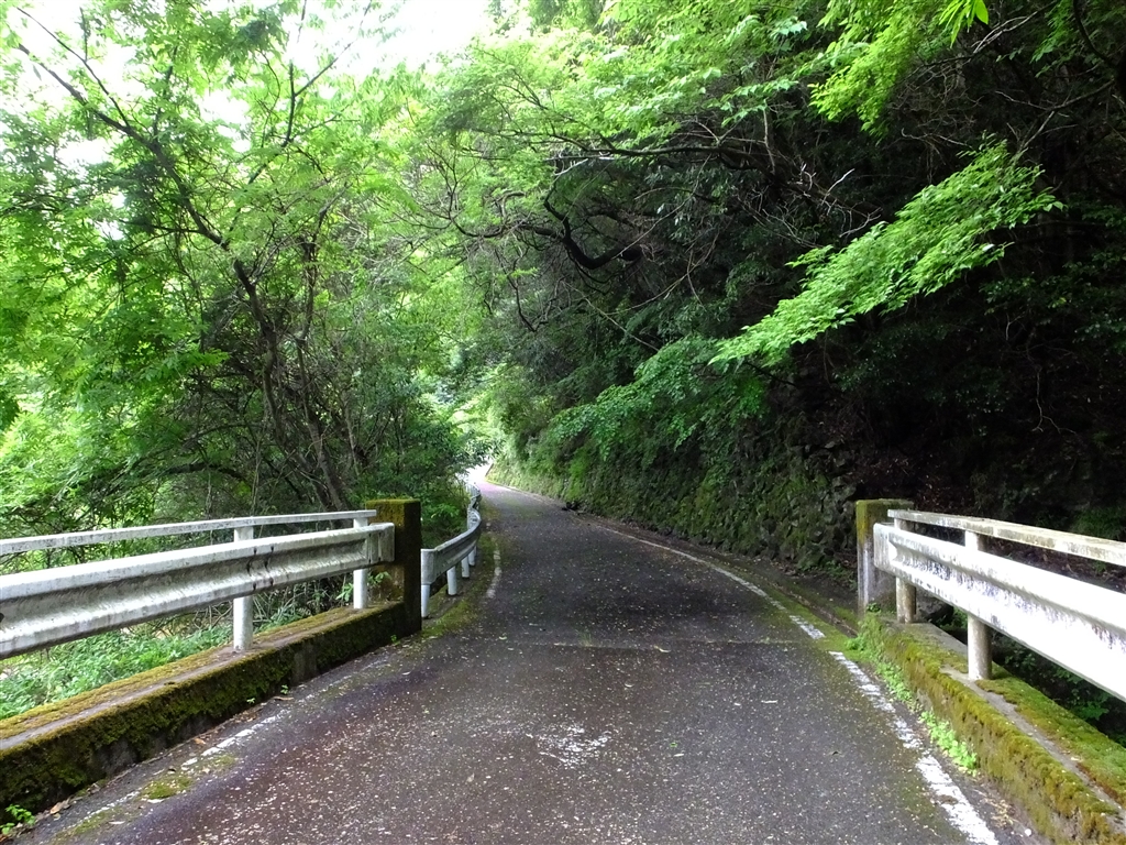 この小さい橋の右手に滝があります、暗い所です、