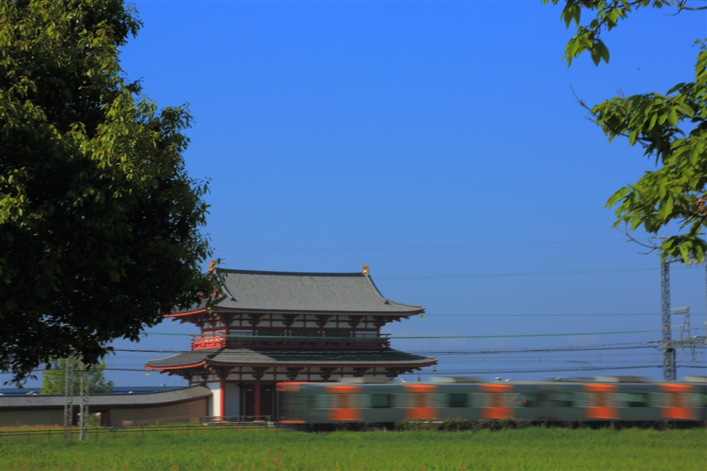 「まほろばを走る」 向こうは朱門 手前は近鉄奈良線