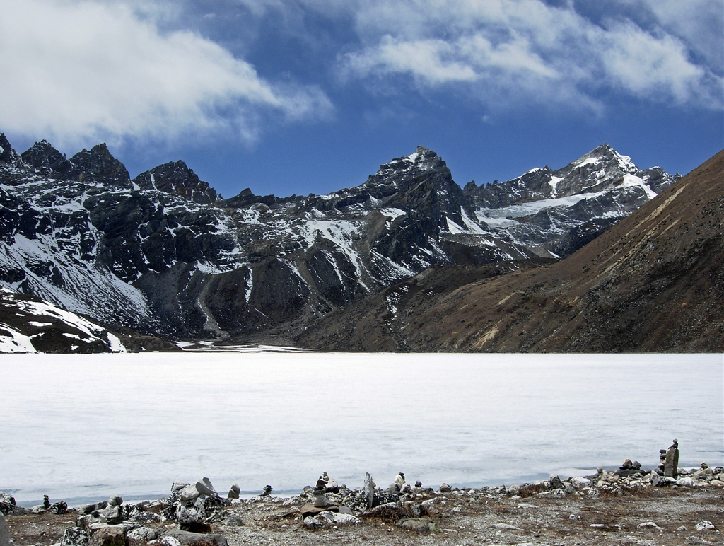 無名峰を背に新雪に覆われた氷河湖