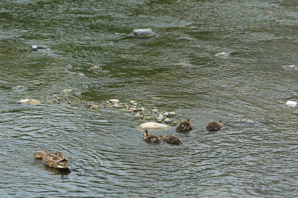 カルガモの親子・・・レンズ交換間に合わず遠くへ