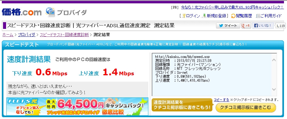 『証拠画像です』 スピードテスト(光ファイバー) こひであきあきさんのクチコミ掲示板画像1/1