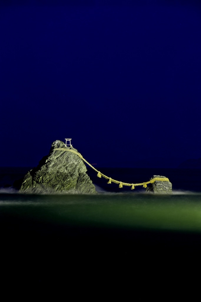 同じく夫婦岩の夜景です(ライトアップしています)