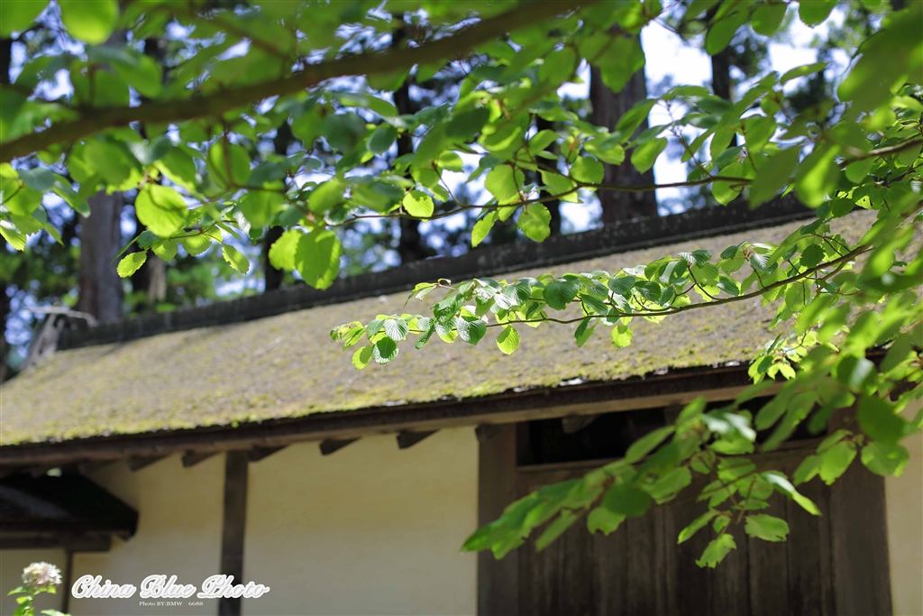 若葉と寺の塀