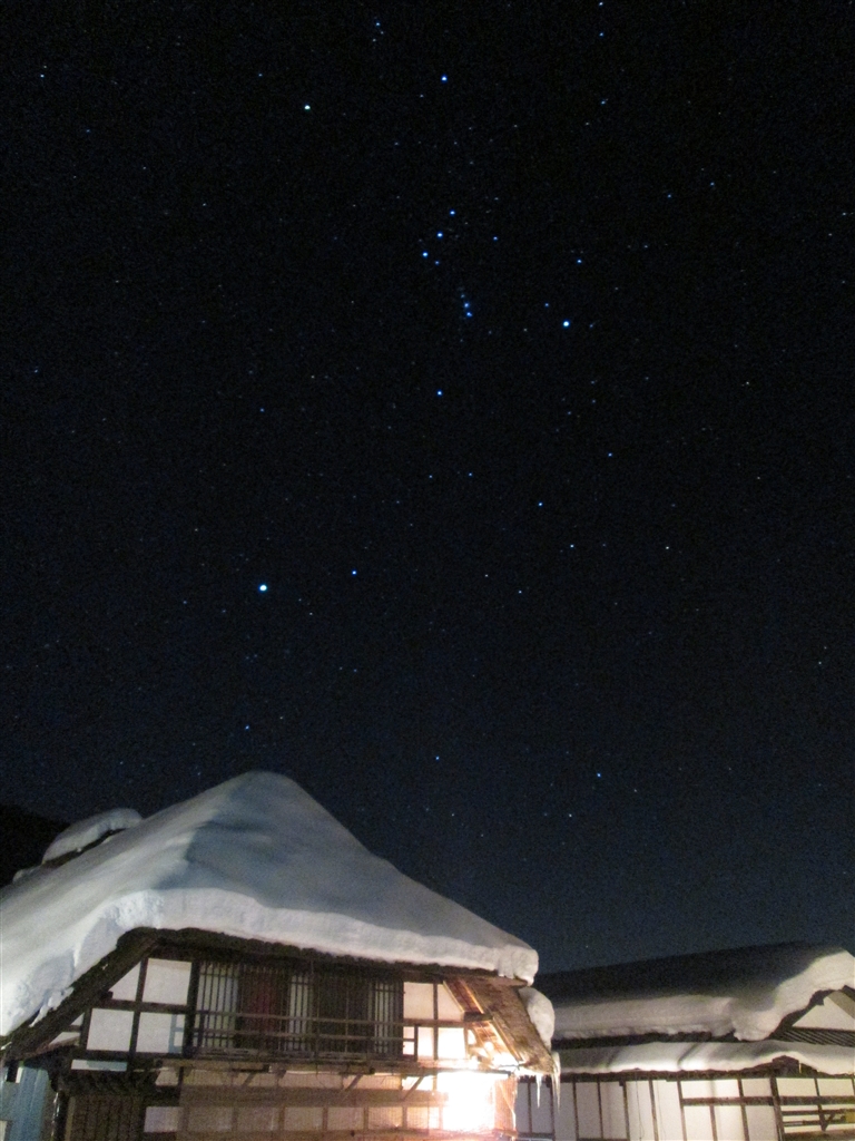 積雪した茅葺屋根に昇るオリオン@大内宿(福島県南会津郡下郷町)