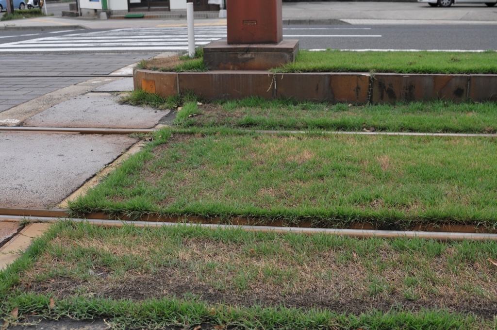 市電の一部では芝生も・・・、でも雨が少なくて枯れそうです。