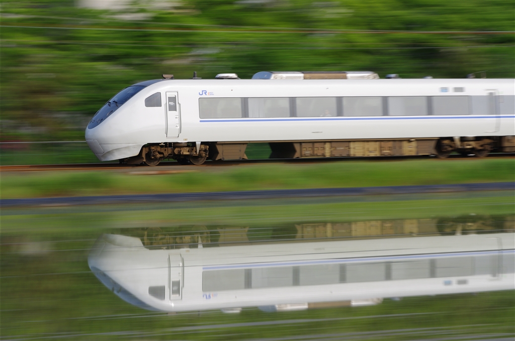 田植え後の田んぼに写るサンダーバード
