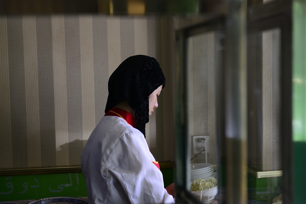 回族の女の子 麺を茹でています