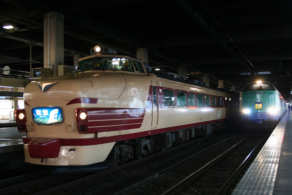 上野からの長旅を終え、金沢駅のホームで体を休める「能登」