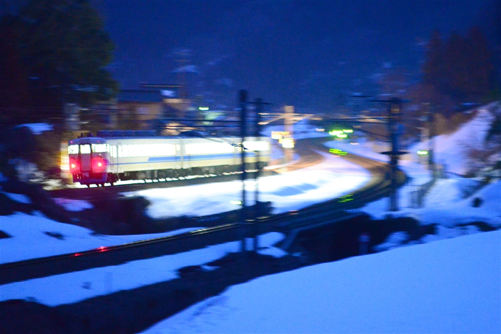 残雪の峠道を行く始発列車(倶利伽羅‐石動)