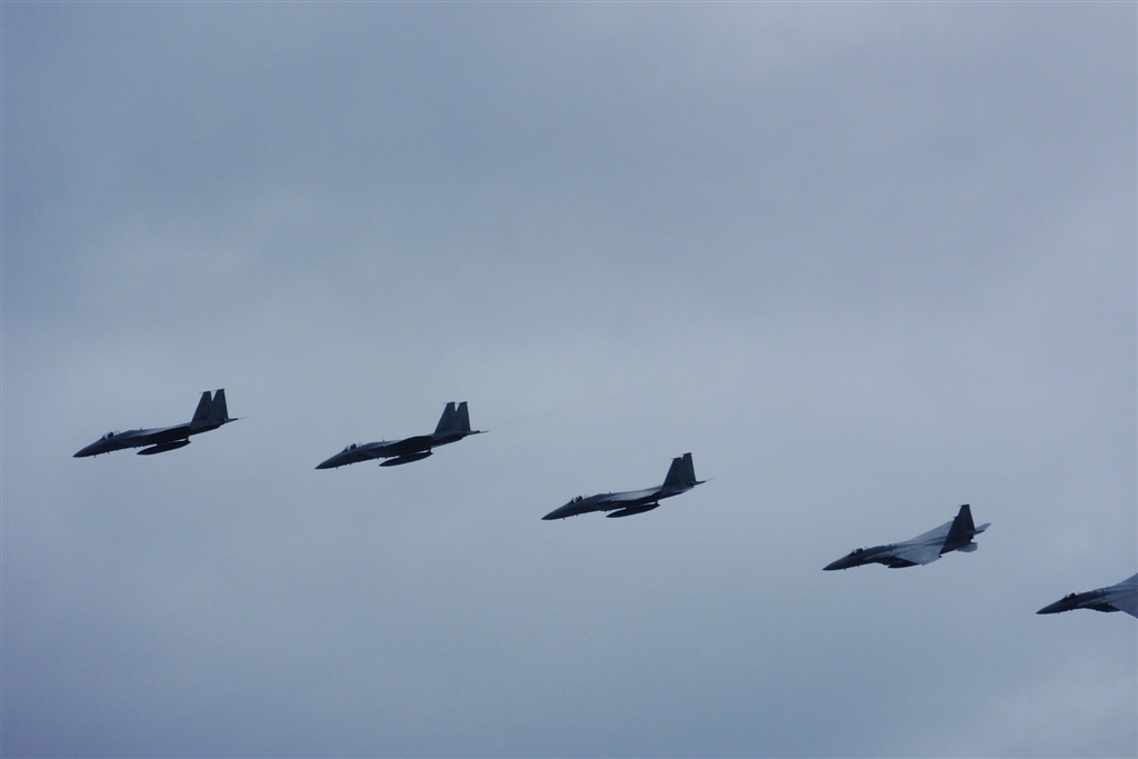 高速道路のサービスエリア上を編隊で通過するF15