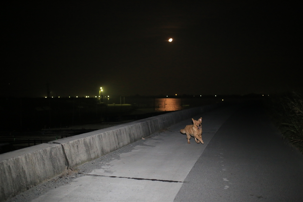あえて赤目がポイント。街頭のない夜にフラッシュ。狼化したワンコ