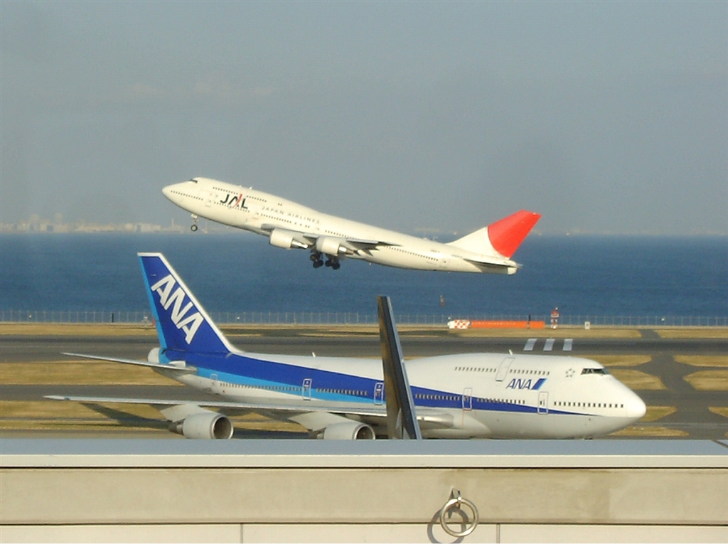 ANAジャンボ機とJALジャンボ機の共演