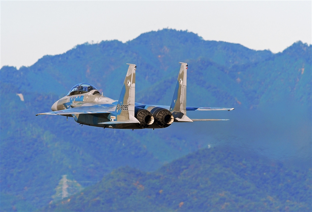 山並みをバックに離陸するイーグル。