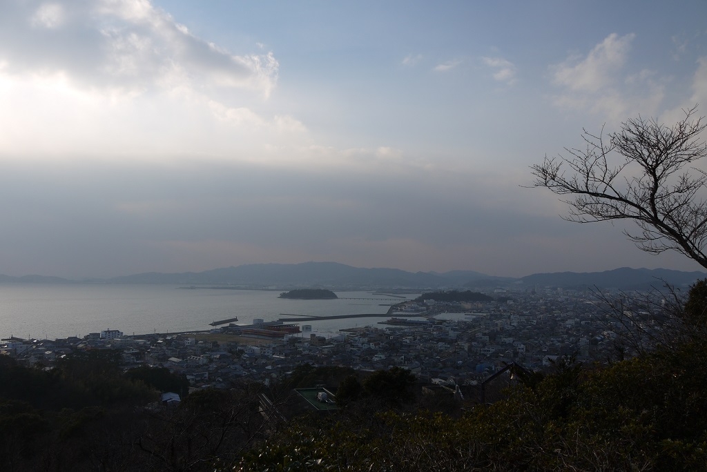 蒲郡市街と、真ん中に浮かんでいるのが竹島です。