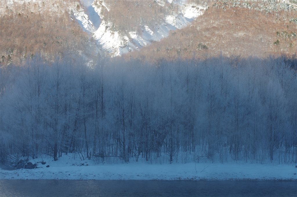 カラマツの霧氷:標高1500m以上で、雲や霧が通過すると霧氷になるそうです。