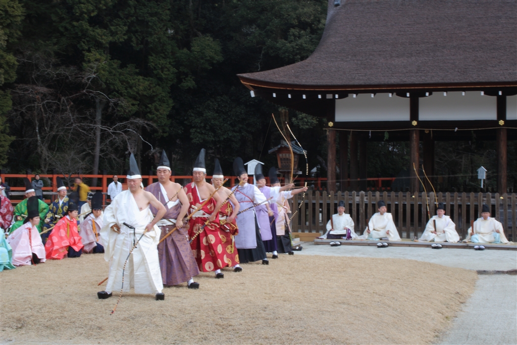 奥から二人目の射手が放った(矢の跡が糸を引いている)