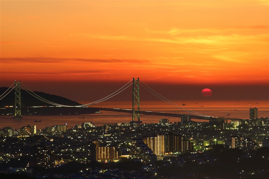 おらが山から見た夕景(夕陽の撮影は17:23、夜景の撮影は18:09)《コンポジット》