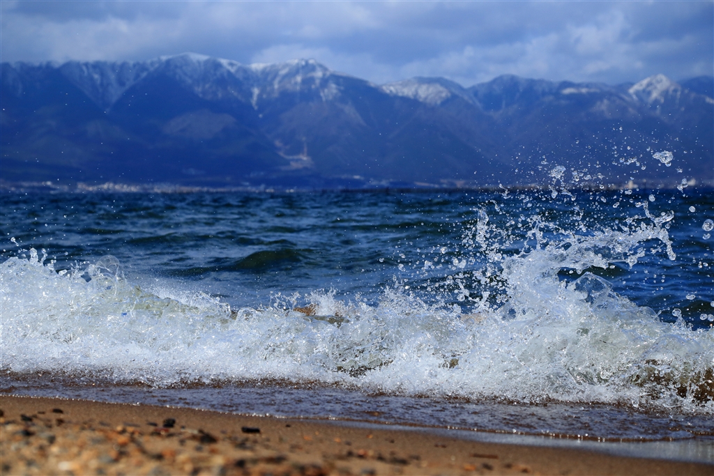 琵琶湖湖岸から比良山系をバックに波の面白さにシャッターを切りまくりました