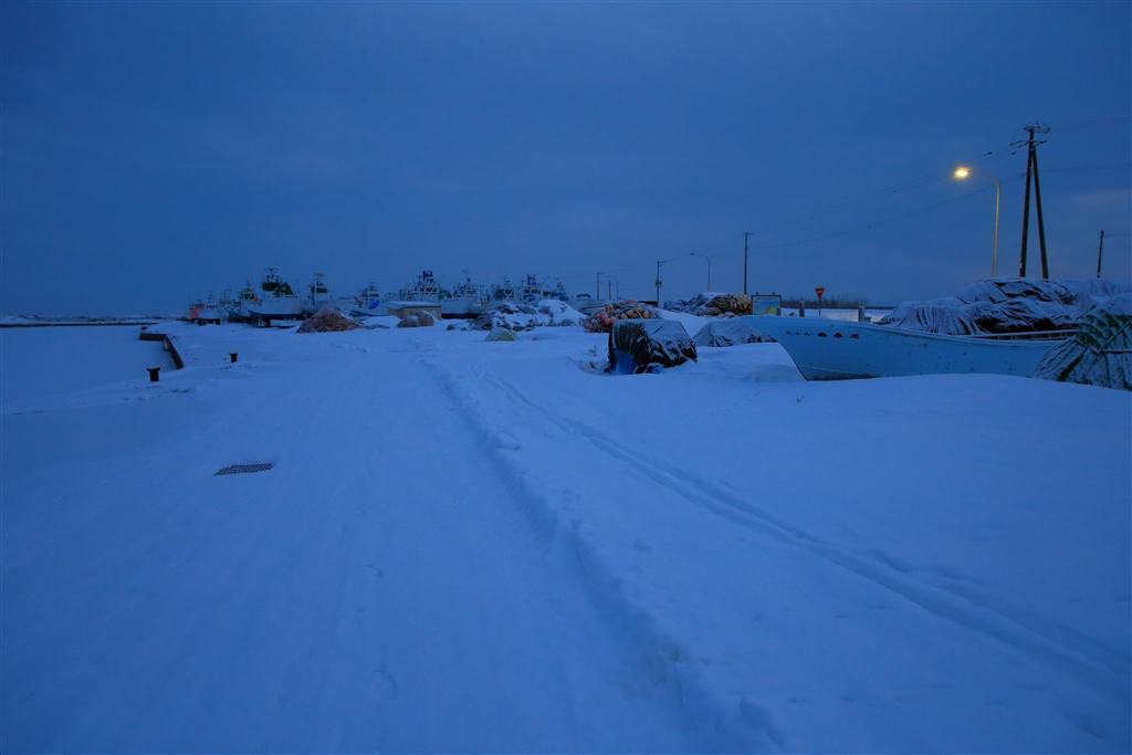 雪と氷で凍てつく羅臼港