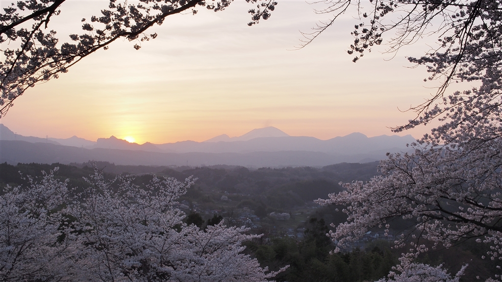 安中市後閑城址公園:妙義に沈む夕日(隣は浅間山)