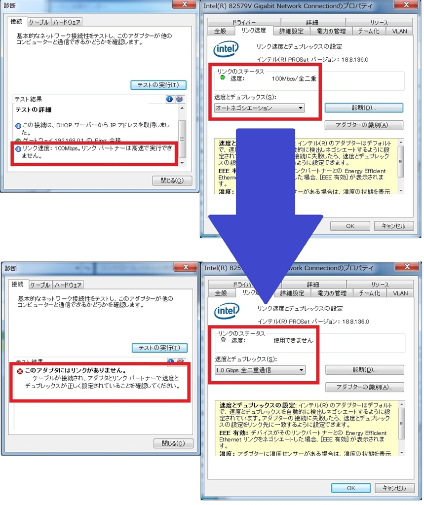 「1.0Gbps 全二重通信」に手動で変更するとリンクが切断