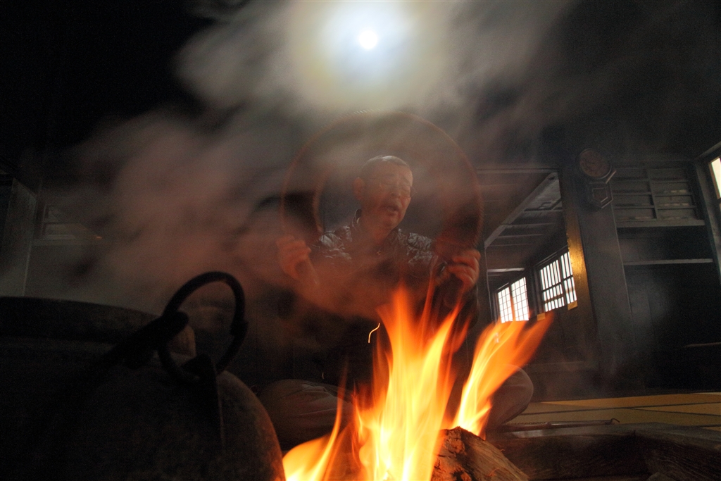 ささらを鳴らしてきこりこ踊りの唄を披露(2)…蒸気の向こうに電灯と当主の顔が見える