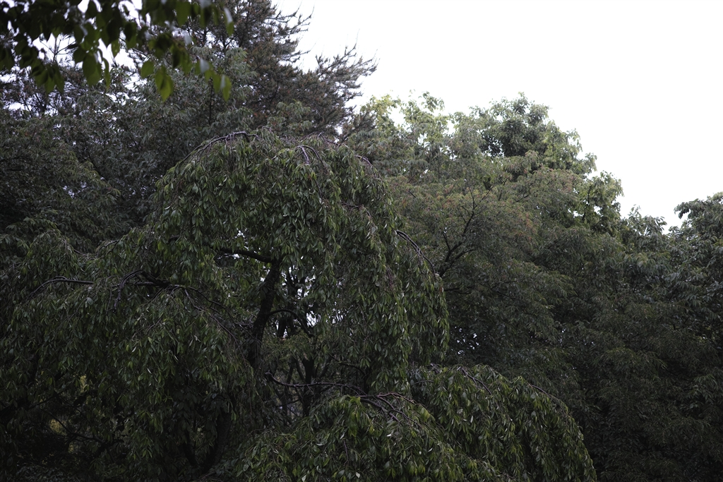 しだれ桜も雨に打たれています。奥に雨粒が写ってます。