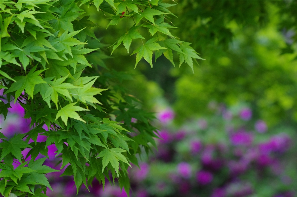 満開のツツジをバックに新緑のもみじが綺麗でした