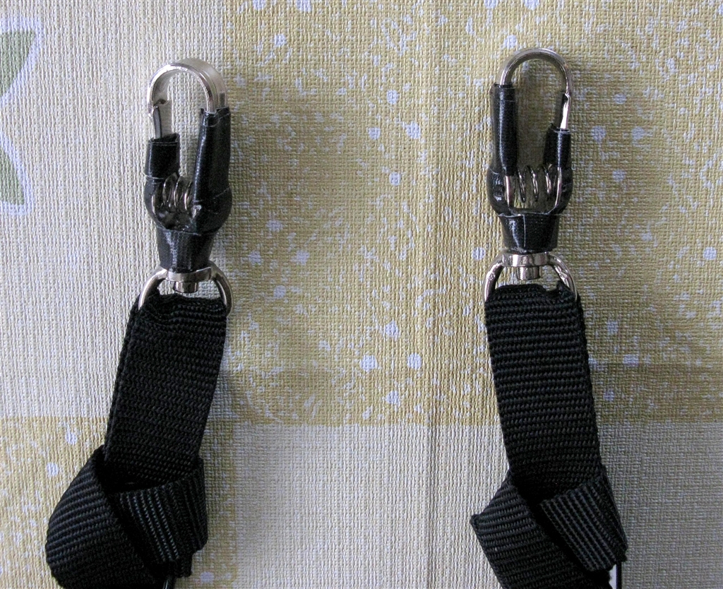 (1) レトロタイプナスカン-15mm(カメラとの擦過防止にとガムテープ巻き付け)をストラップに取り付けた状態