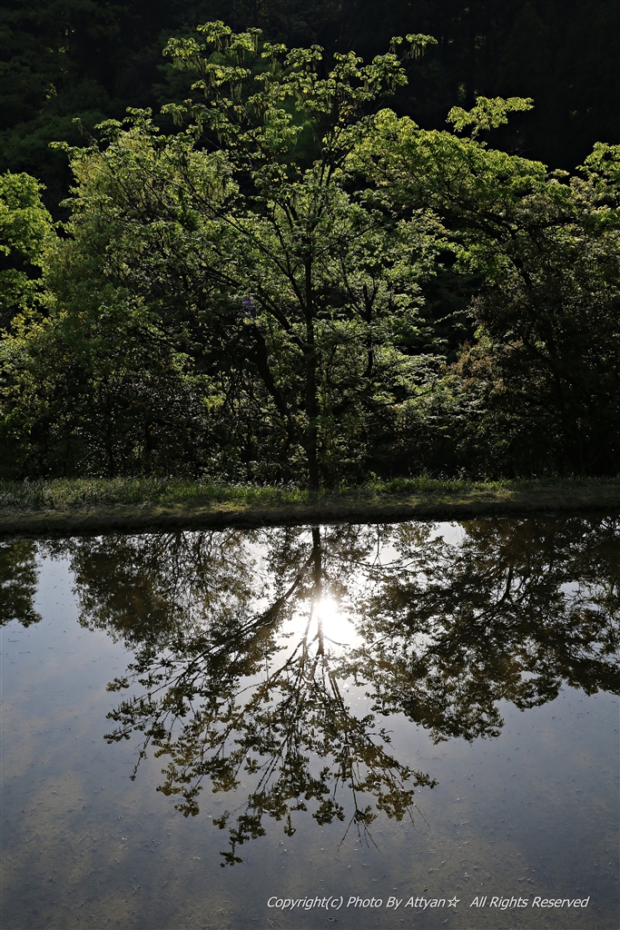 山間の棚田の写り込みを撮影しました