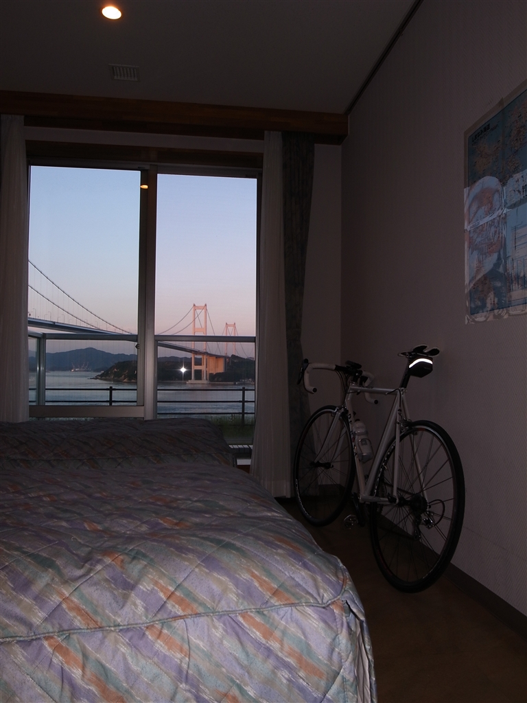 自転車を部屋に置ける良心的な宿 窓の向こうは来島海峡大橋