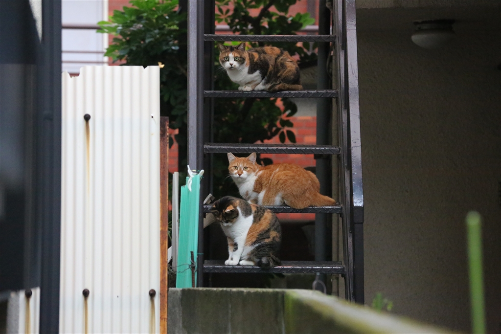 上の2匹は蝶を目で追っています(白い壁?の右上に蝶がいます)