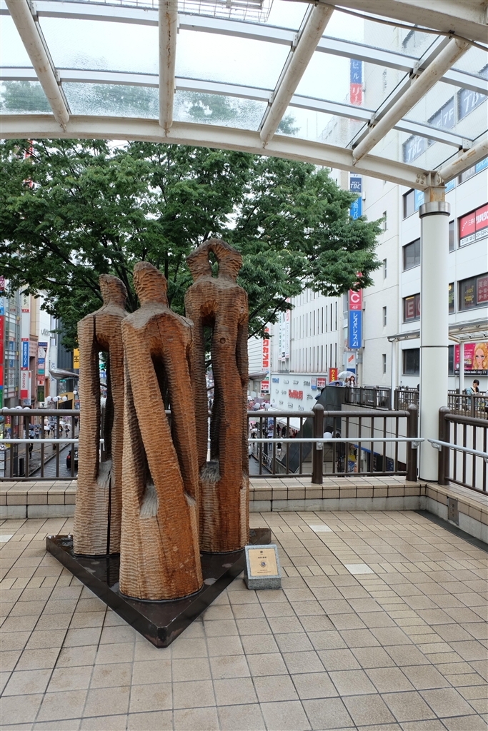 立川駅北口のオブジェ・・・背景に悪魔の館が^^