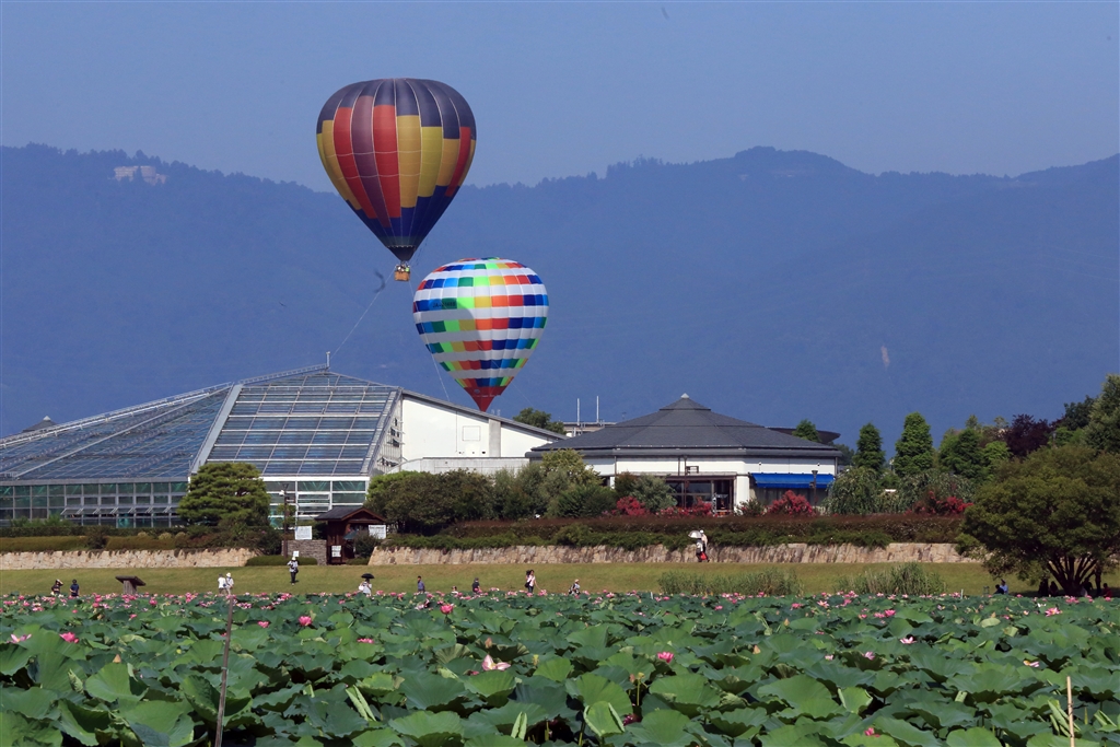 水生植物園遠望「気球・手前は。ハスの群生地」