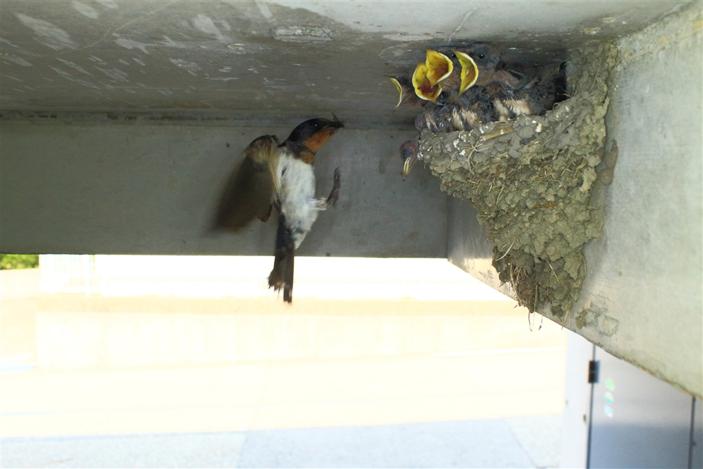 5羽のヒナに親鳥がせっせと餌を運ぶ