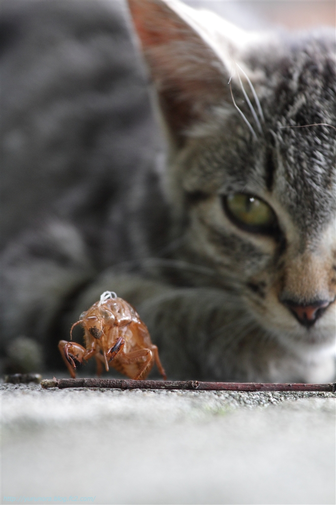 猫とセミ (抜け殻)
