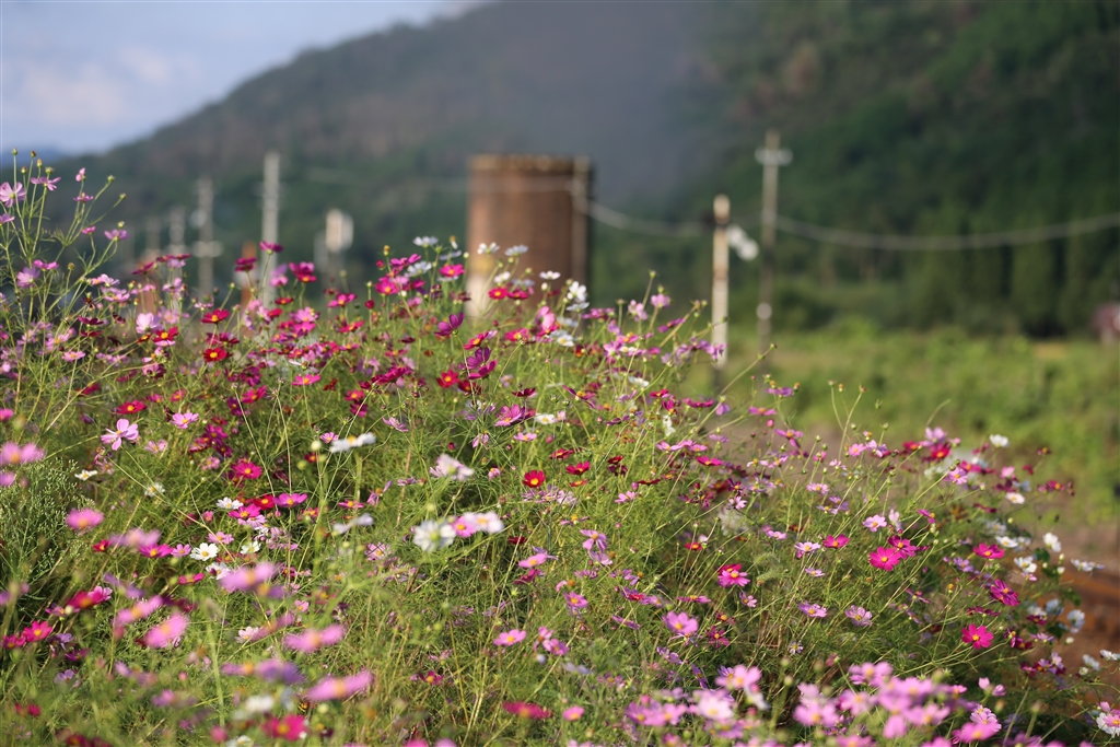 篠目駅旧給水塔をバックにコスモスを撮ってみました。