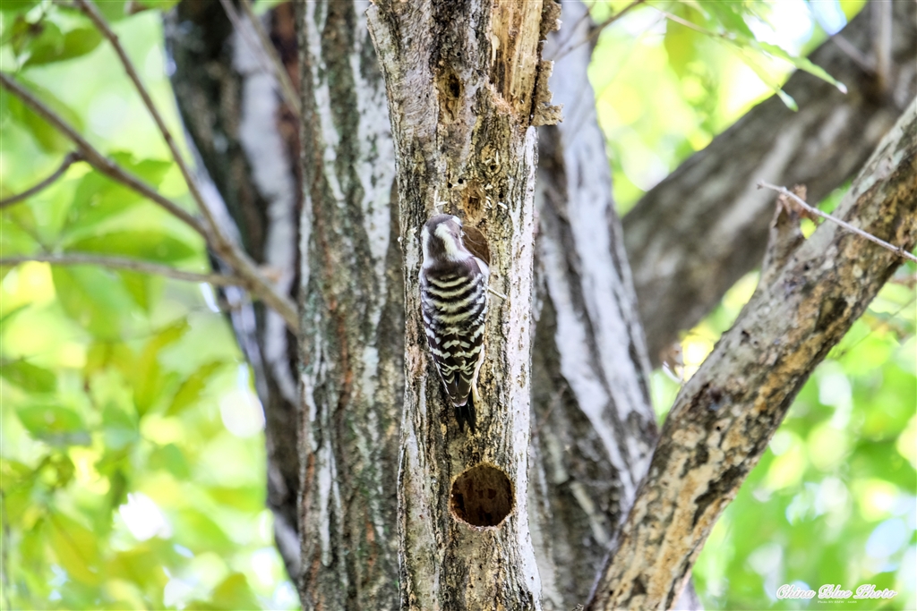 コゲラがコンコンと木の幹をたたいて巣穴つくり。