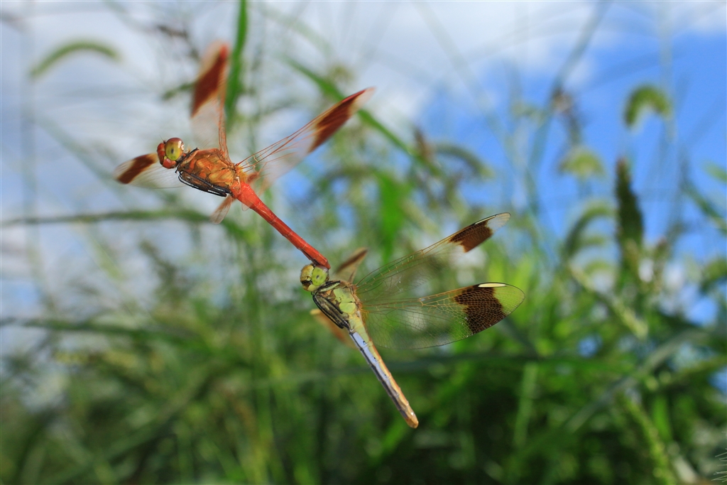 やや見上げる格好で撮る(トンボの表情などがよく見えるためと背景の処理のため)
