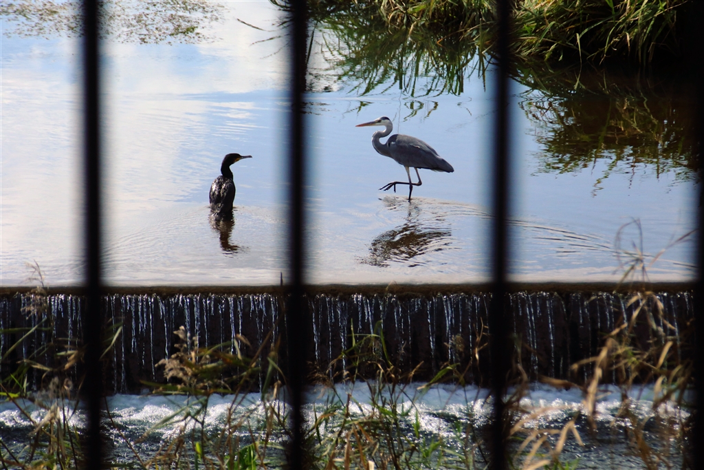 鵜とシラサギのにらめっこ「餌場争い..車の窓越しから」