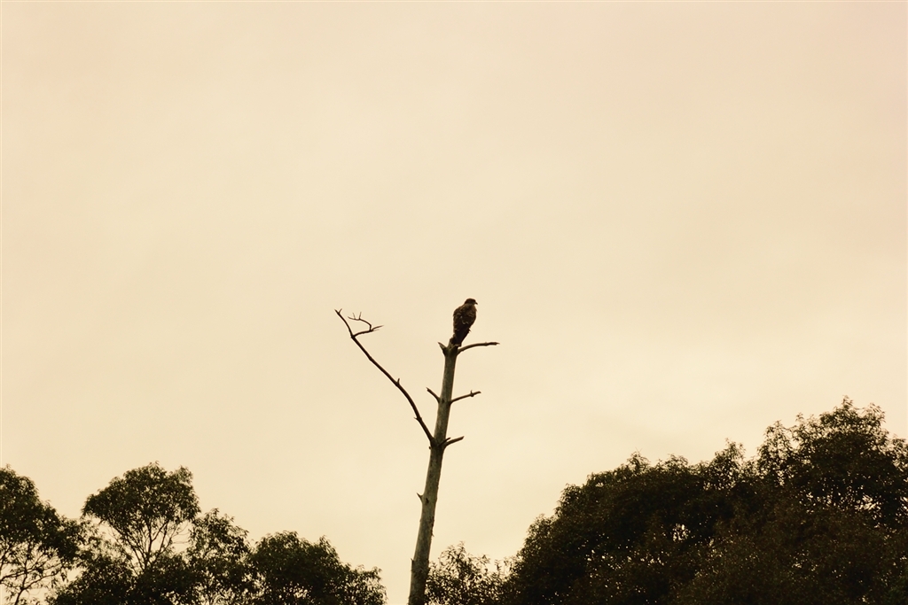 遙か遠くの小高い山の上の枯れ木の天辺に鳶が留まっていた。V3+70-300mm