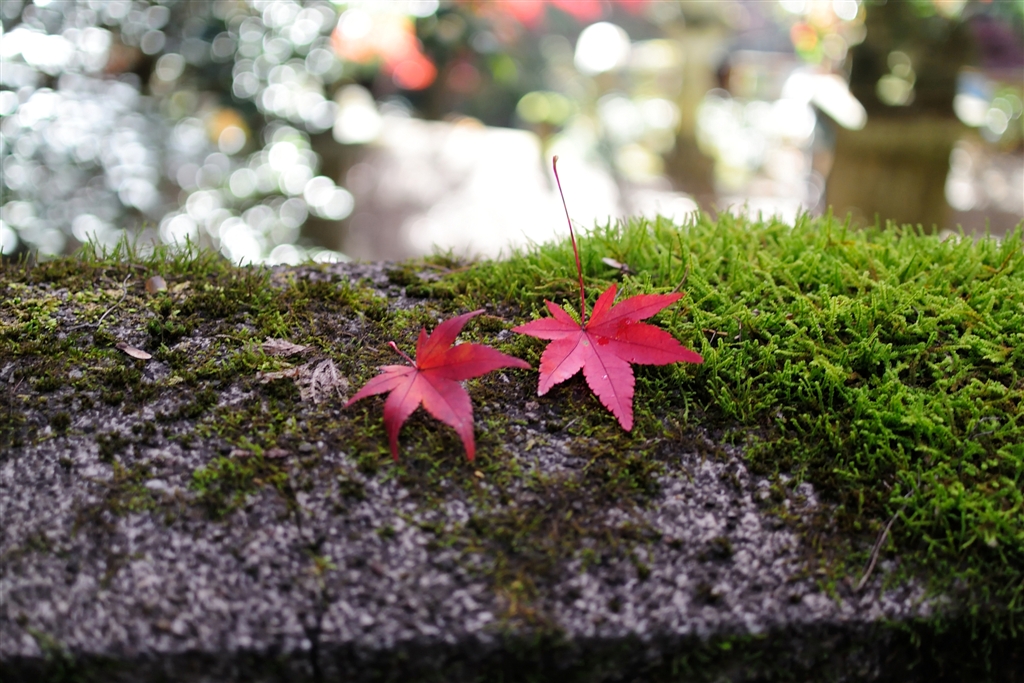 紅葉に木漏れ日、葉っぱは置きました