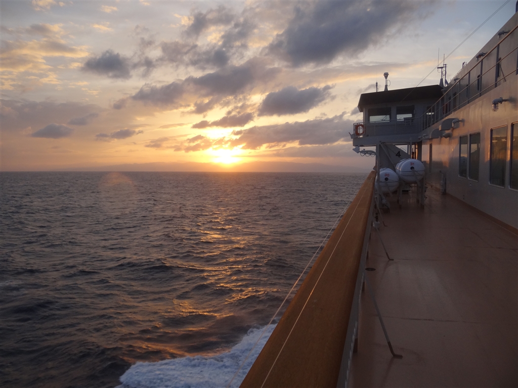 佐渡島に沈む夕陽(波高3m位でしぶきが飛んできた。)