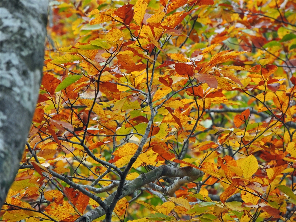 3 ブナの色づきの終盤が近づくと緑が消えて黄と赤の紅葉