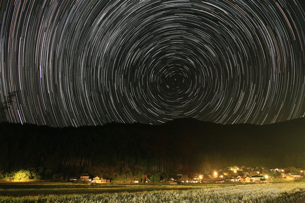 かやぶきの里の上で星が日周運動する