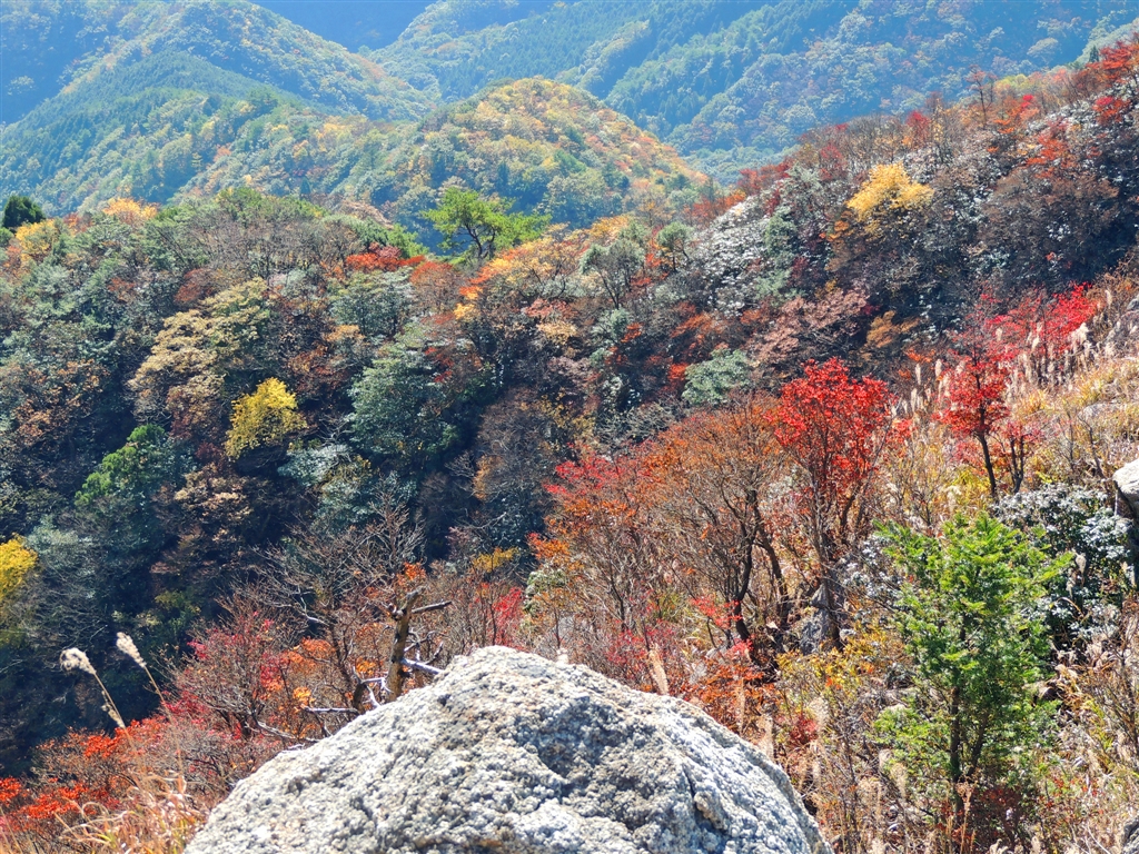 3 鎌尾根南面・錦秋の赤はシロヤシオ、黄はシロモジ
