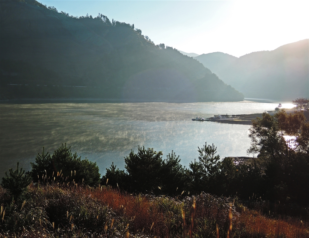 1 青土(おづち)ダムの川霧 朝7時気温5℃、水温より低いようで立ち上る
