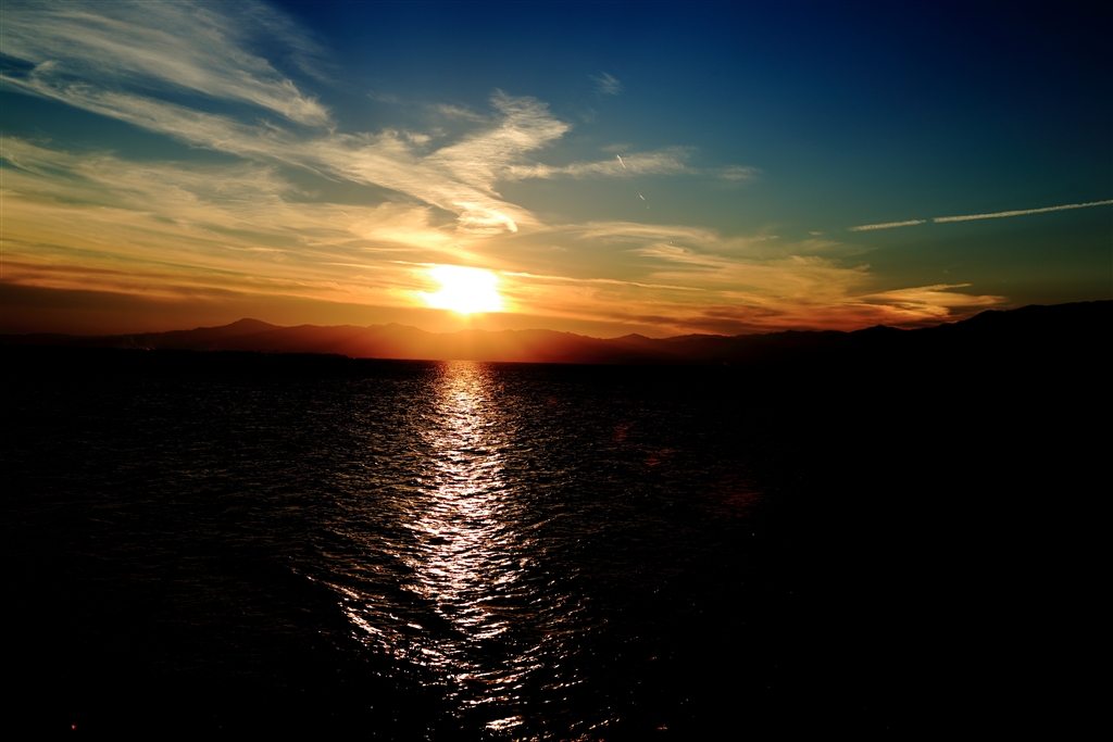 比良山系に沈む太陽「遠方の雲が邪魔した、、」